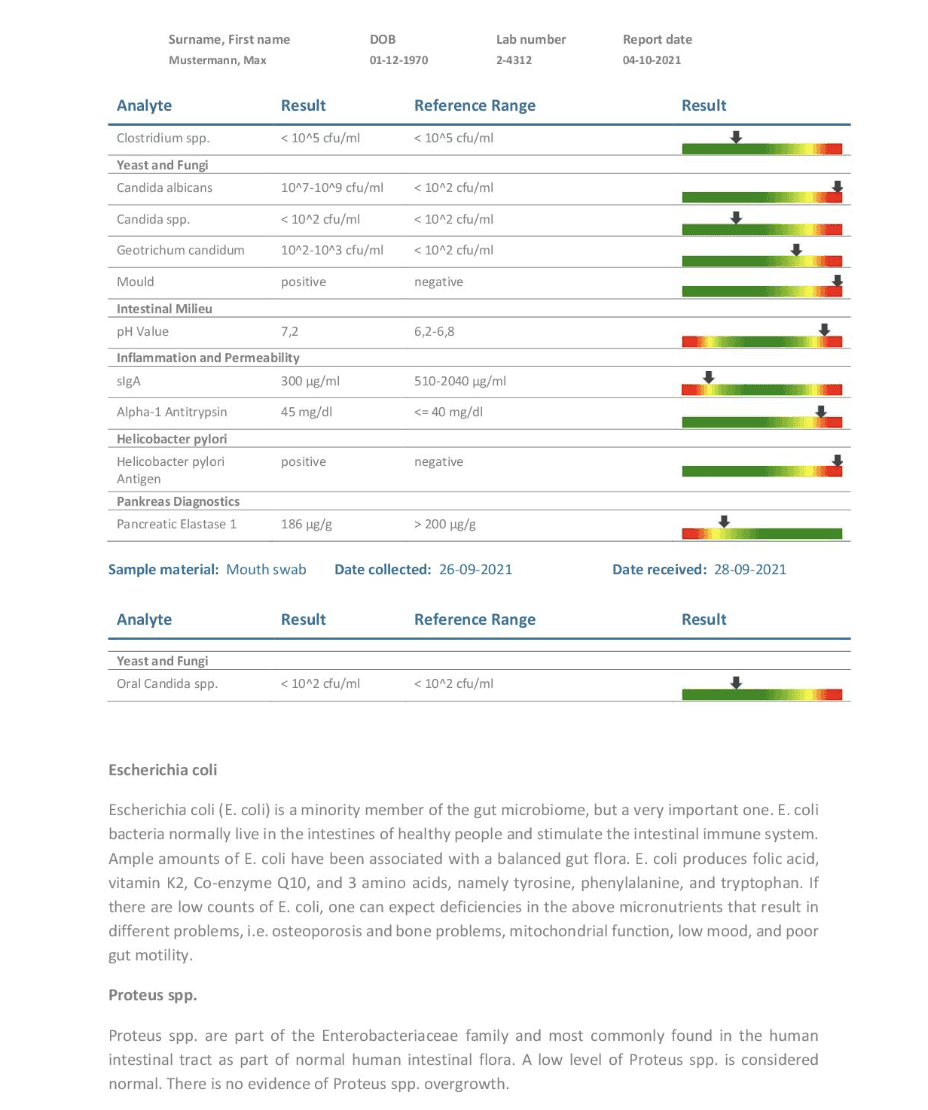 We turn complicated data into clear insights. Your digital dashboard shows an easy-to-read clinical summary highlighting gut imbalances, biomarkers, and priority action areas